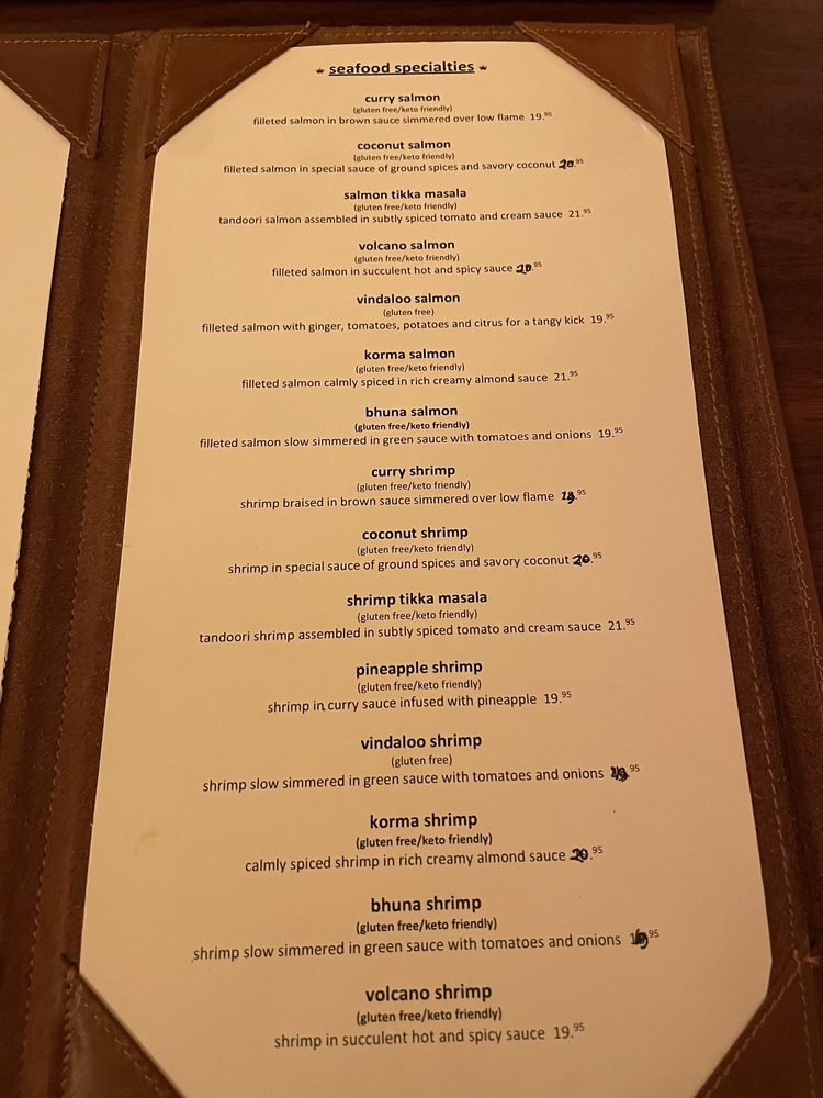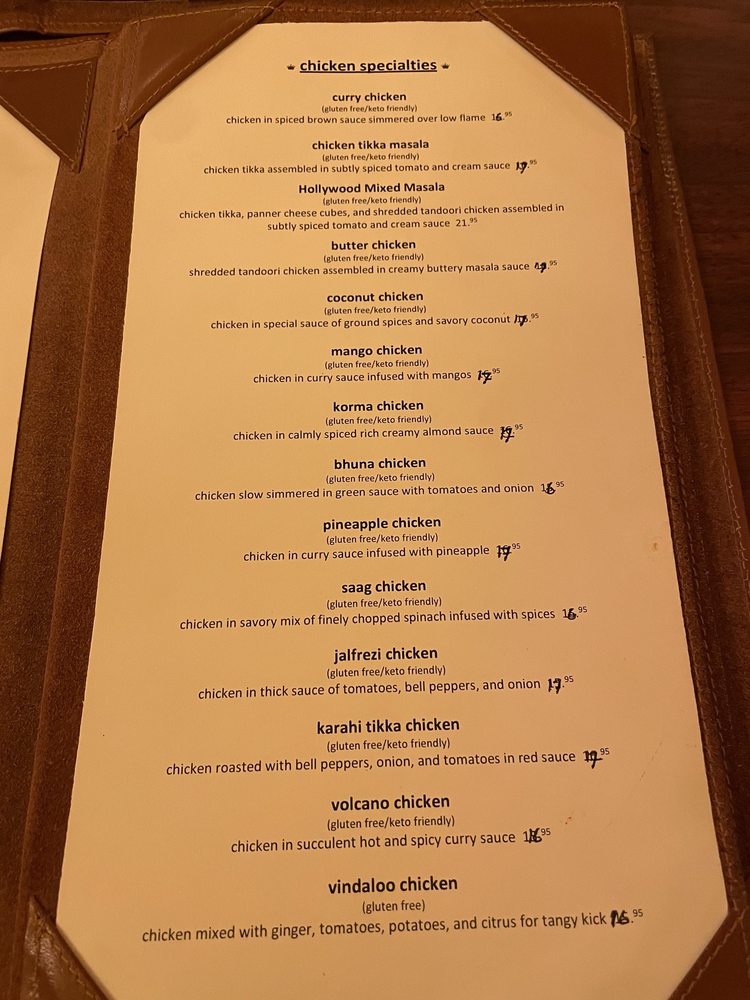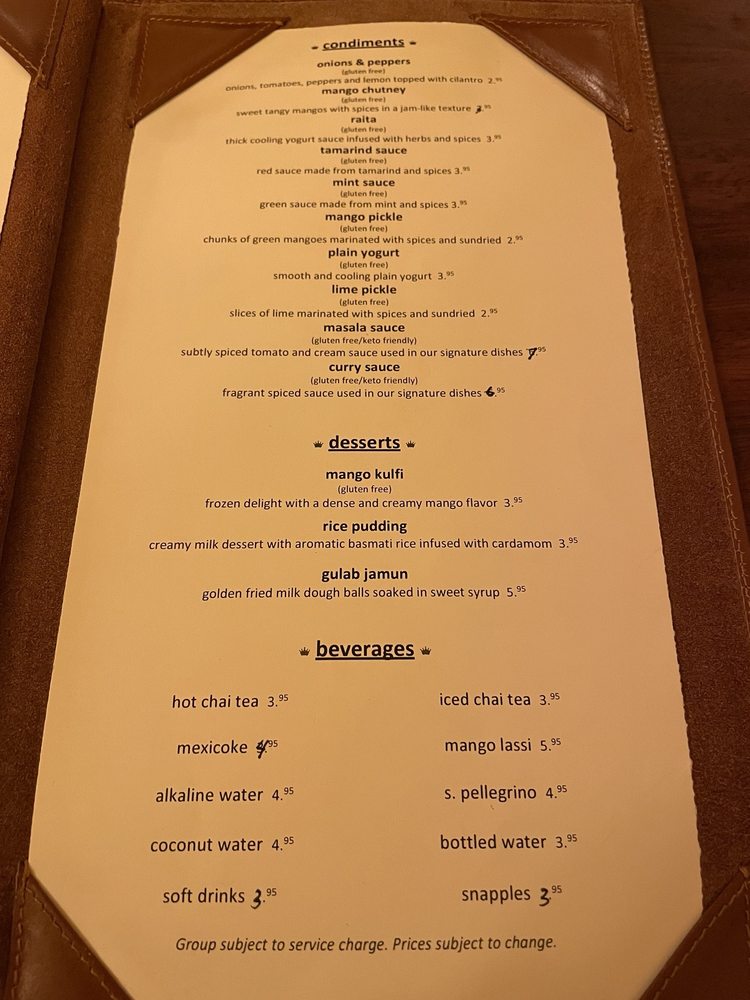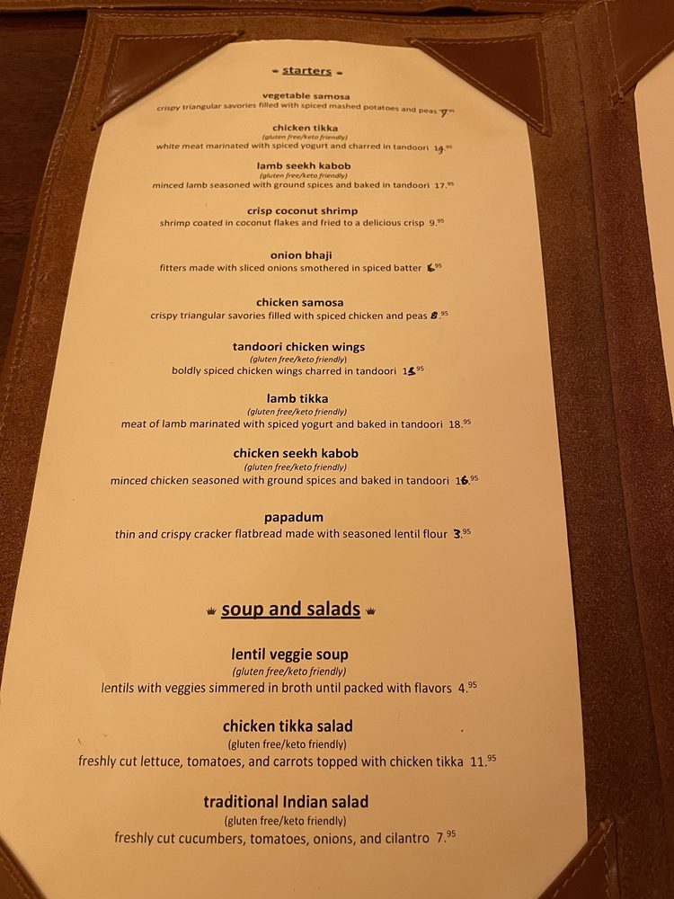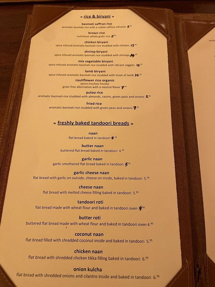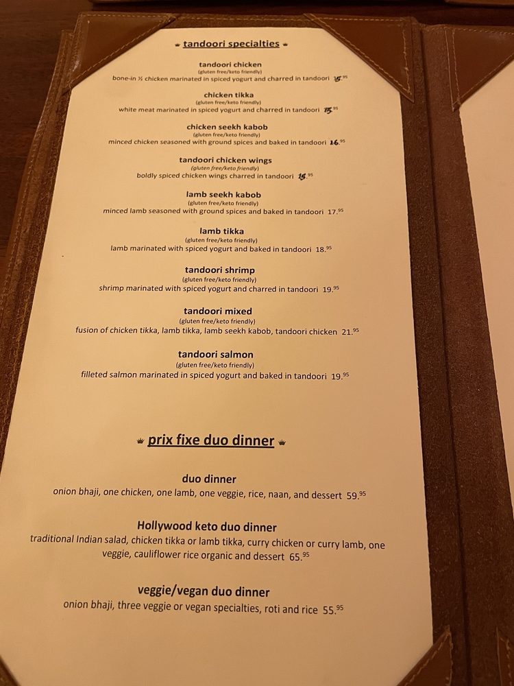 Traditional Indian Salad. Choice of chicken tikka or lamb tikka. Choice of curry chicken or curry lamb. Choice of one veggie specialty. Cauliflower rice organic. Mango kulfi.