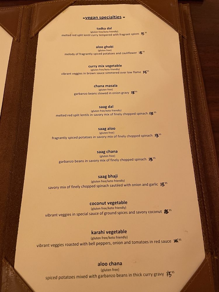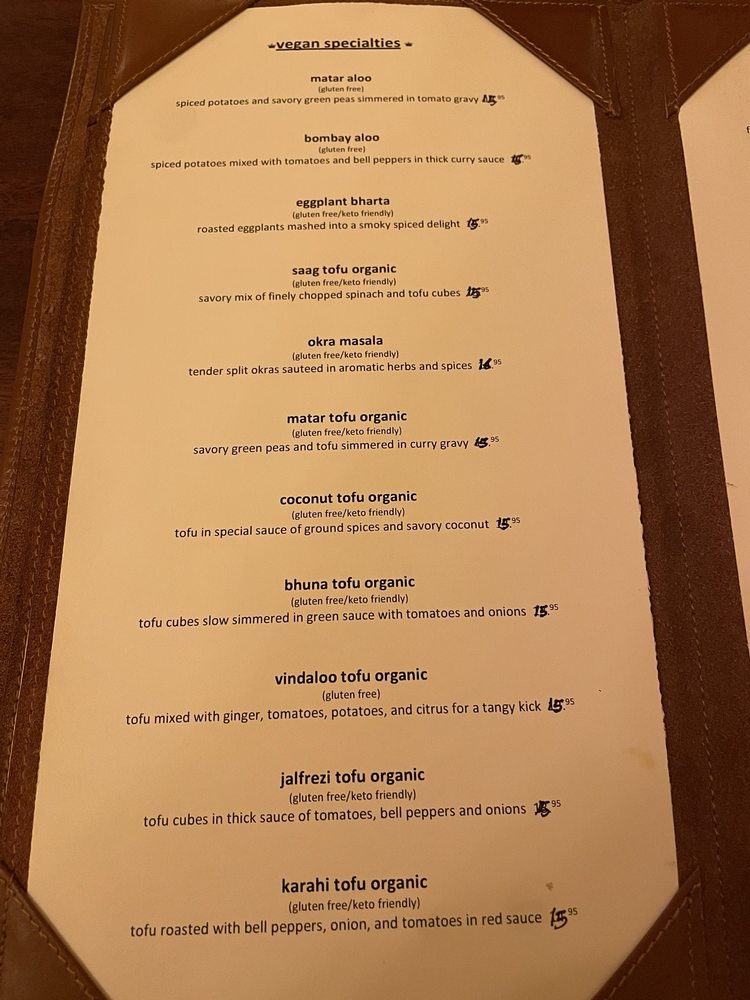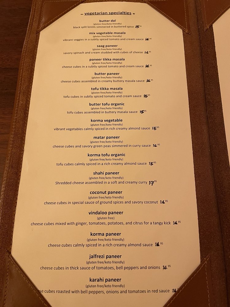 Onion Bhaji. Choice of three veggie specialties. Naan. Basmati saffron rice. Gulab jamun.